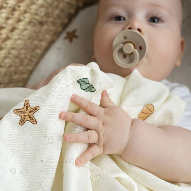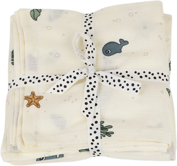 Et sæt med to svøb dekoreret med det søde Sea friends print med hvalen Wally, vandmanden Jelly og flotte havelementer. De bløde økologiske muslin-svøb er behagelige, åndbare og søde – en nødvendighed for ethvert nyt forælderpar! Svøb din baby for komfort eller for at finde ro til at sove. Ved at svøbe din baby efterligner du det sikre miljø fra moderens livmoder og forhindrer barnet i at bevæge sine arme og ben der kan virke forstyrrende for søvnen. Et sødt sæt i et mix af mustard, grøn, blå, pudder og beige. Svøbene kan vaskes ved 60°C og bliver blødere og blødere ved hver vask. En naturlig kvalitet af materialet, er det krøllede og vaflede look, som svøbene får efter vask.