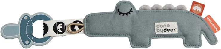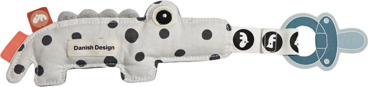 Croco keeps pacifiers close by and joins tiny sleepy heads when it's time to head off to dreamland. The coolest little comforting companion in soft blue and with black Happy dots. Cozy keeper with a Velcro clip and an elastic loop for both pacifiers with and without handles.