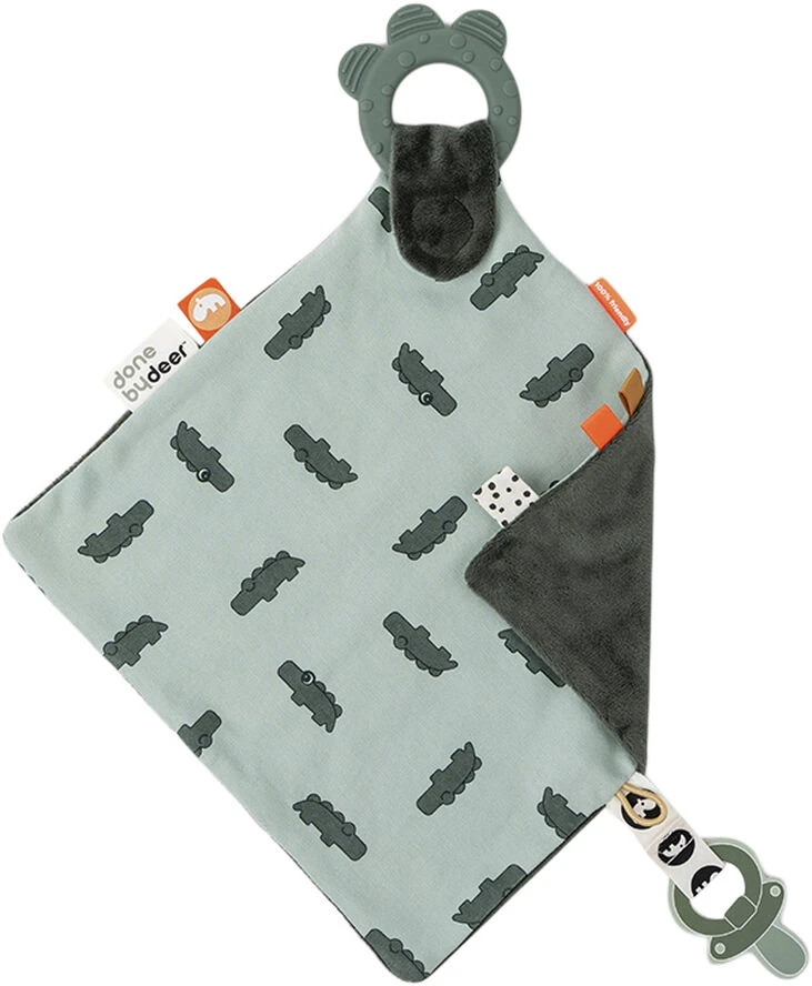 De mindste kan putte med denne søde Croco nusseklud og udforske de sensoriske deltaljer: sjove mærker, Croco-printet samt forskellige teksturer på bideringen. Nussekluden vil gøre din baby tryg og rolig, og være en hyggelig putteklud når det er sovetid. Den søde silikone bidering med krokodilleskæl og forskellige teksturer, der stimulerer barnets sanser og beroliger kløende gummer, kan også bruges for sig selv. En praktisk Velcro clip og elastik-loop kan holde styr på både sutter med og uden hank. En sutteklud er en rigtig baby must-have. Denne, i grønne nuancer, har et sødt krokodille print og farverige mærker, der er hyggelige for små fingre at nusse med.