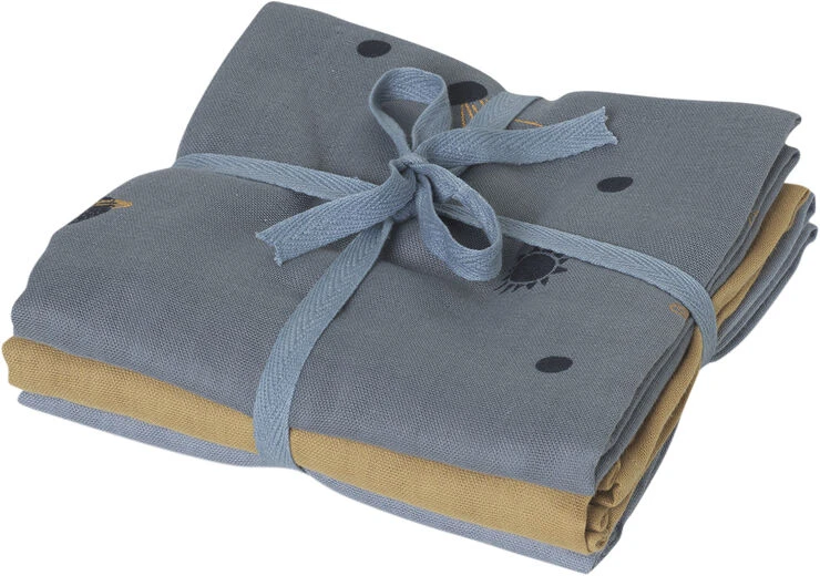 I en familie med små børn kan man aldrig have for mange stofbleer til at amme, som hagesmæk eller til at skærme for solen i barnevognen. Muslin-stofbleerne giver dig en frisk ny version. Med en printet og to gennemfarvede er dette sæt af tre stofbleer lavet af 100 % økologisk og GOTS-certificeret bomuld og er den bedste måde at komme lidt ekstra farve ind i hverdagen med en baby.