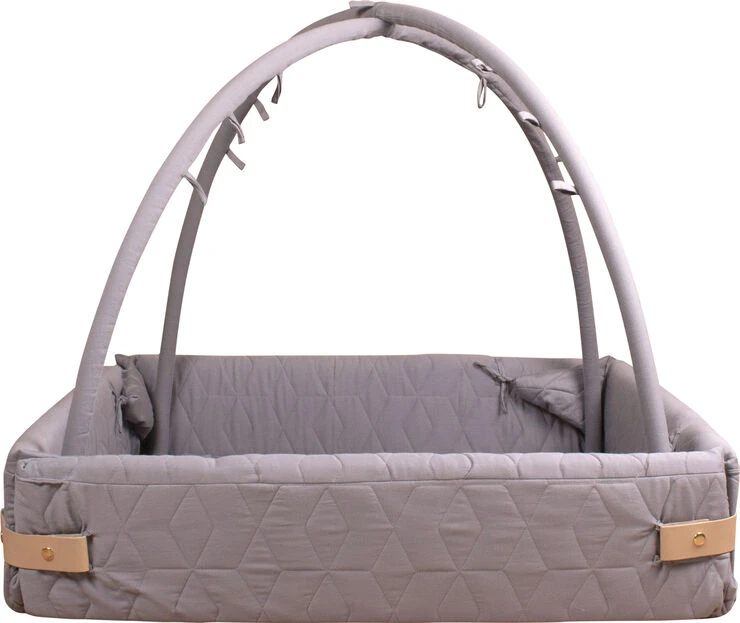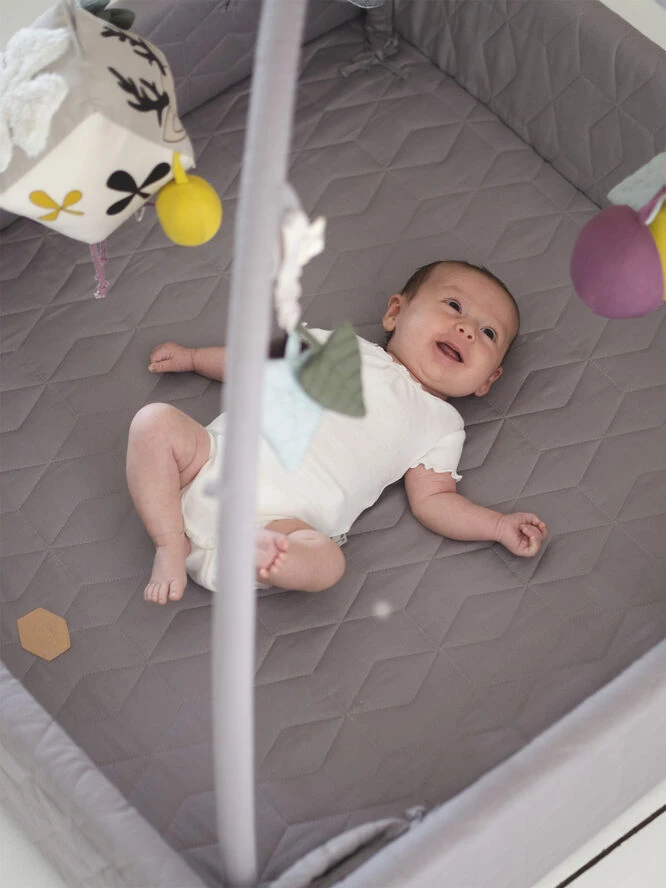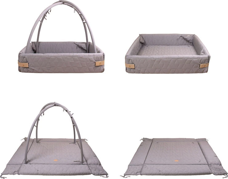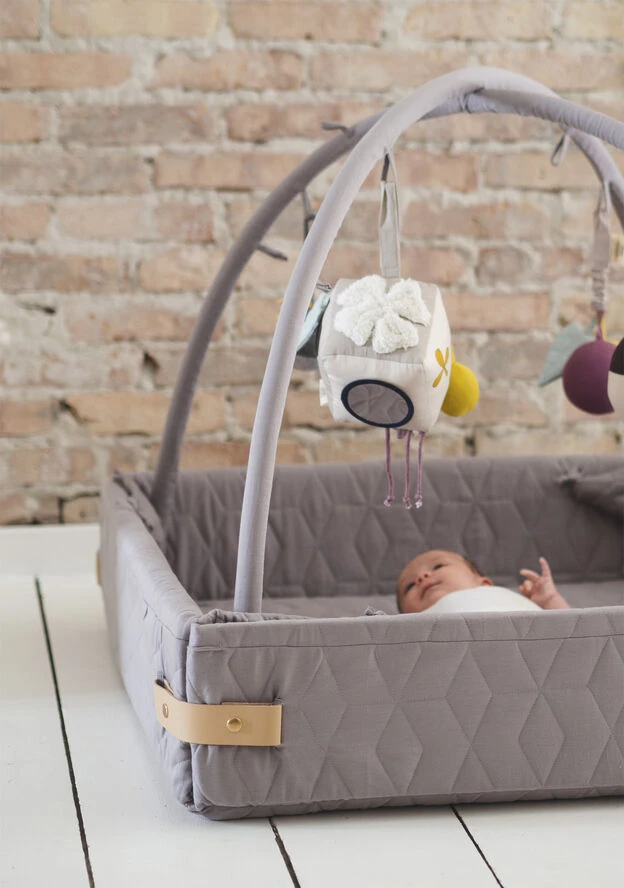 Aktivitetsnesten er udviklet til at vokse med barnet, da den har flere funktioner. Brug den som kravlegård, aktivitetstæppe, legetæppe, babynest. Når baby er helt lille kan aktivitetsnesten med fordel bruges med siderne lukket og med aktivitetsstænger på, til at hænge legetøj i eller stængerne kan tages helt af og man har en større baby nest – evt. til tvillinger. Samtidig kan siderne foldes ned, hvis man vil sidde på tæppet sammen med den lille eller når den lille begynder at kravle rundt. Når barnet bliver større kan man bruge den som legetæppe med siderne foldet ned og uden stænger monteret. Aktivitetsnesten lukkes med læderspænder der klikkes fast med en trykknap