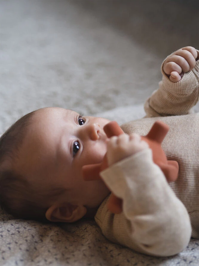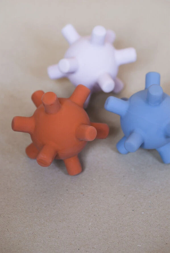 Filibabba har designet denne motorik bold, som er god for udviklingen af barnets fin-motorik og som desuden er god at bide i, hvis barnet har ømme gummer. Bolden er produceret i 100% naturgummi.