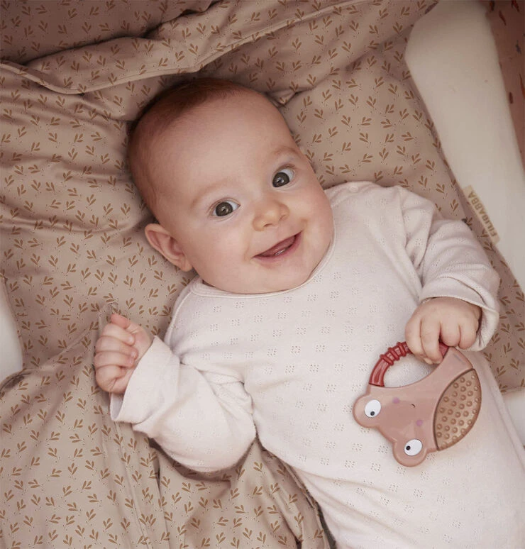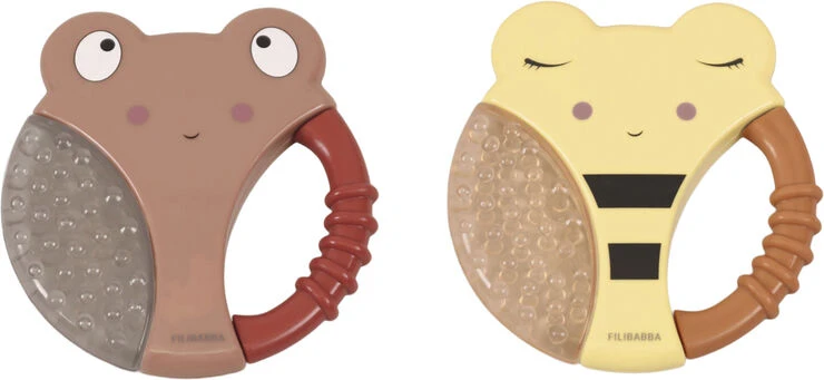 Smarte kølebideringe formet som en sød bi og en larve i rolige farver. Kølebideringene er fyldt med sterilt vand og lindrer barnets ømme gummer ved tandfrembrud. Det lille håndtag med struktur gør det nemt for barnet selv at gribe om ringen. Bideringene er designet med spændende strukturer og former, som stimulerer både mund og hænder. Bideringene har en rolig klokkelyd, så de også fungerer som rangler. For at opnå den kølende effekt lægges bideringen i køleskabet. Brug aldrig fryser til nedkøling. Med denne smarte 2-pak kan du altid have en bidering klar i køleskabet til ømme gummer.