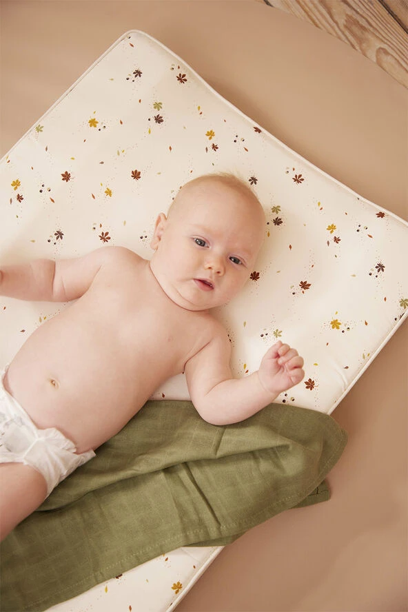 Hvem elsker ikke de store farverige blade og de skinnende kastanjer, der gemmer sig som små perler i deres grønne skal? Vores Chestnut print viser årstidens budbringere, som du kan finde på en skattejagt i det dejlige efterårsvejr. Kom med og se, hvad der gemmer sig i skovbunden! Vores skønne puslepude er fremstillet i økologisk satinvævet bomuld med en polyesterskumkerne. Derudover har vores puslepude et PU-lag (polyurethan), som gør puslepudens overflade vandafvisende og nem at tørre af efter bleskift. Er uheldet ude, hjælper den skjulte lynlås dig med at tage betrækket hurtigt af, så du kan vaske det efter behov. Husk at trække betrækket i form og putte det direkte på skumkernen efter vask. Lad betrækket tørre på sengeranden for at mindske risikoen for, at det krymper.