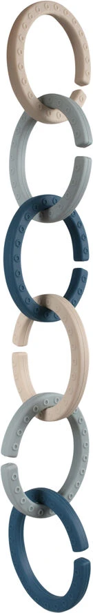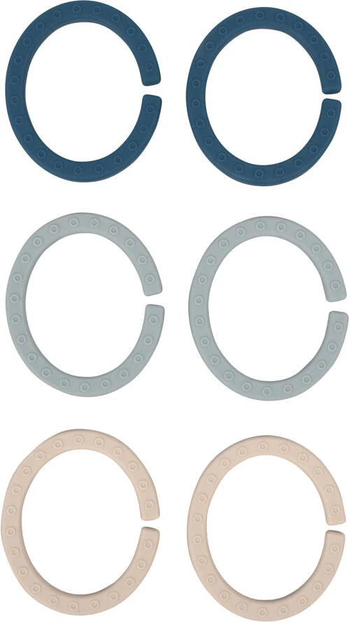 Vores bløde ringe i silikone er perfekte til at hænge babyens legetøj op med. Brug dem f.eks. til at hænge legetøj på aktivitetstæppets stænger eller i barnevognen, kravlegården, puslepladsen og autostolen. Ophængsringene er det perfekte tilbehør til vores Loui aktivitetstæppe. Sættet består af seks ringe, som du nemt kan sætte sammen, så legetøjet kommer tættere på barnet. En enkel ring kan også bruges som en dejlig bidering. De bløde og fleksible ophængsringe er lavet af slidstærk og superblød silikone, som du nemt kan rengøre i opvaskemaskinen. Den fine æske indeholder ringe i farverne creme, støvet grøn og mørkeblå.