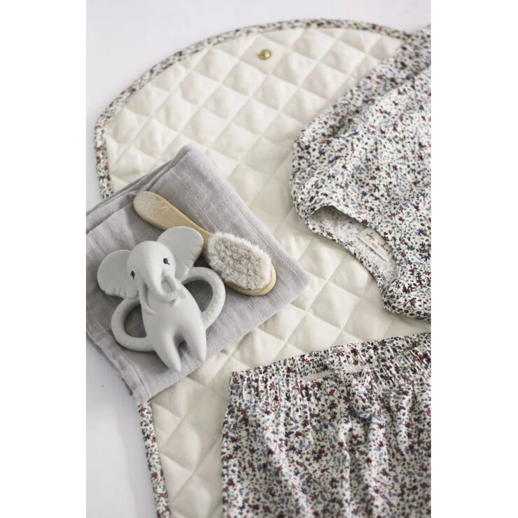 Our iconic changing pad makes any diaper changing situation easier due to our practical and functional design. The snap button allows you to handle the change with one hand, and the two pockets makes room for all the diaper changing essentials.When you're all done you will find it easy to quickly slip the pad back into your bag. With its 70cm length it is useful from birth until the child is diaperfree. The changing pad is made of 100% organic cotton.Folded: Length: Længde: 25 cm / Width 35 cm – Unfolded: Length: 70 cm / Width: 69 cm